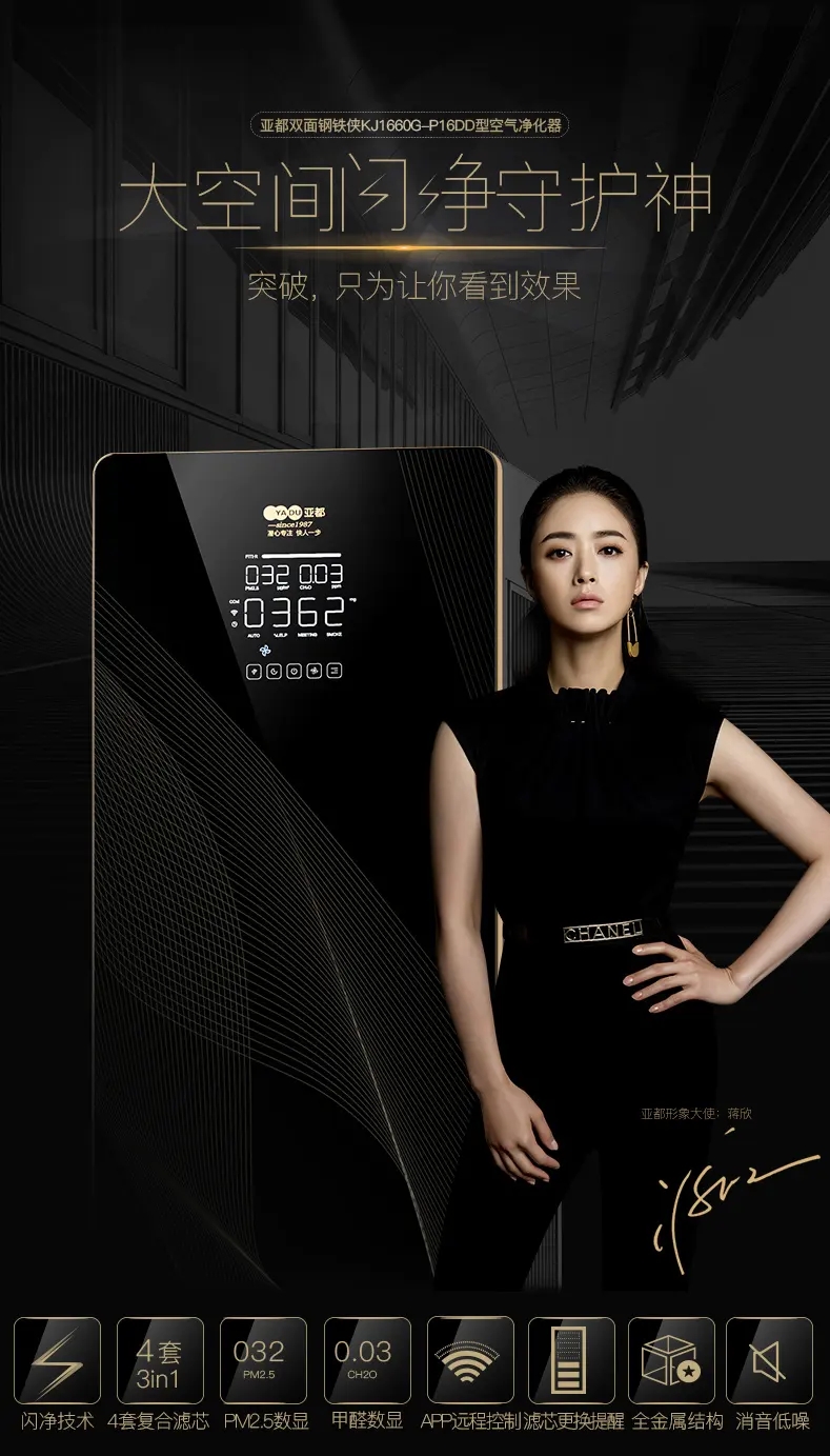 鋼鐵俠產(chǎn)品機(jī)身采用全金屬材質(zhì)手工打造,面板采用鋼化玻璃燙印,黑屏視窗,白晶顯示,機(jī)身數(shù)值 (PM2.5\甲醛)一目了然;對于業(yè)界最難的室內(nèi)甲醛濃度顯示,鋼鐵俠給予了完美的解決方案,它采用的是新一代自適應(yīng)整定傳感器及合理設(shè)置采樣點(diǎn),可以實(shí)時(shí)顯示室內(nèi)甲醛濃度;對于現(xiàn)在浸染大半個(gè)中國的霧霾,雙面?zhèn)b更是“除之而后快”,1660超高CADR值,雙面串列4濾芯模組,室內(nèi)霧霾可以“一掃而光”;我們的華妃娘娘蔣欣還特別關(guān)注到了該機(jī)器的超靜音功能,采用了雙風(fēng)機(jī)多孔消音技術(shù)的鋼鐵俠,可以在開機(jī)同時(shí)設(shè)置超靜音,讓娘娘辛苦拍戲的同時(shí),擁有輕松好睡眠。有了好睡眠,自然有好精力趕走后宮一片“陰霾”啦!
