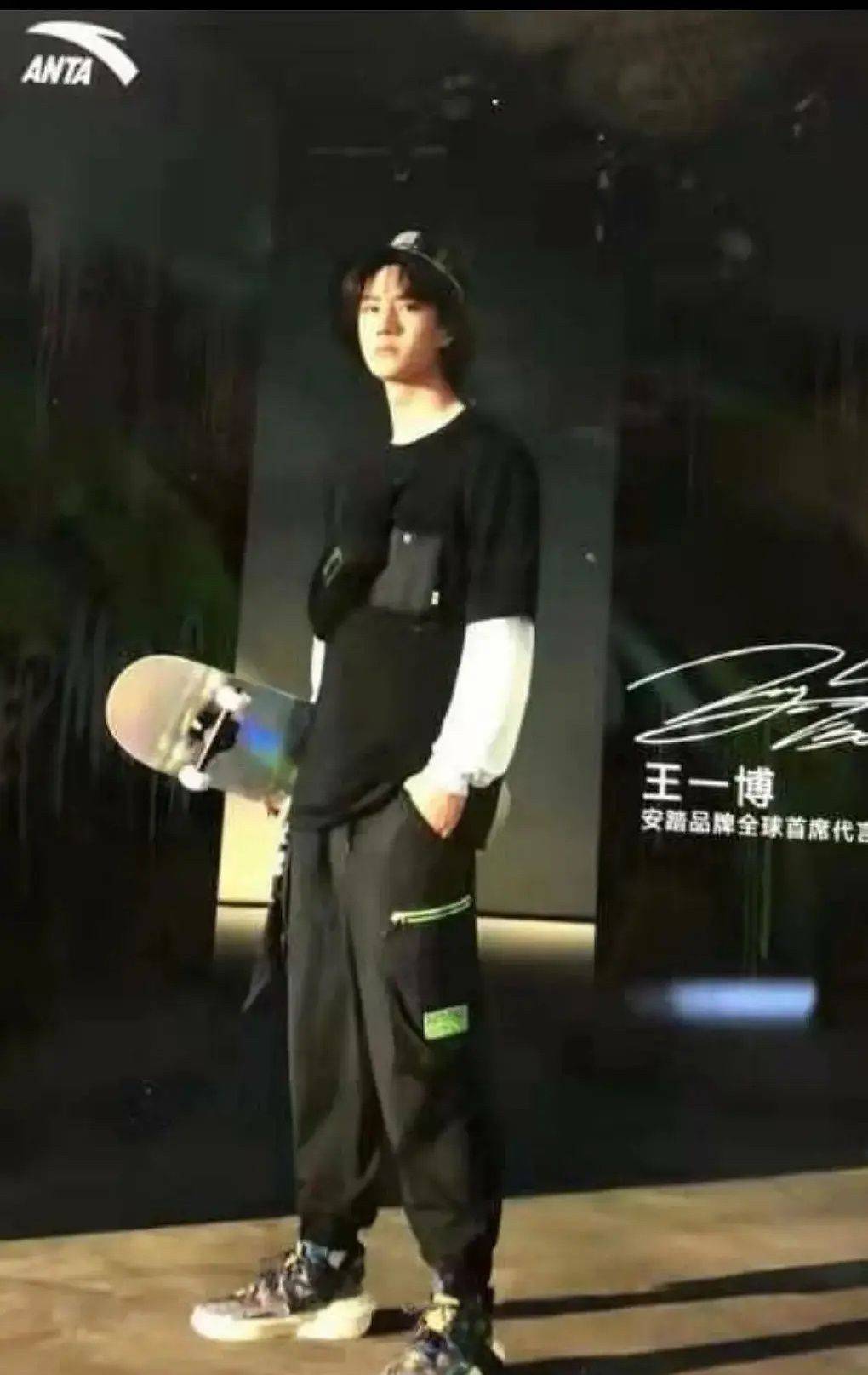 身穿黑色短袖T恤內(nèi)搭白色長袖,長短袖疊穿造型時髦又有層次感,將運動與時尚完美融合。下身搭配黑色運動褲和拼色運動球鞋,手拿滑板頭戴漁夫帽,讓人更加堅信照片中的人就是王一博。