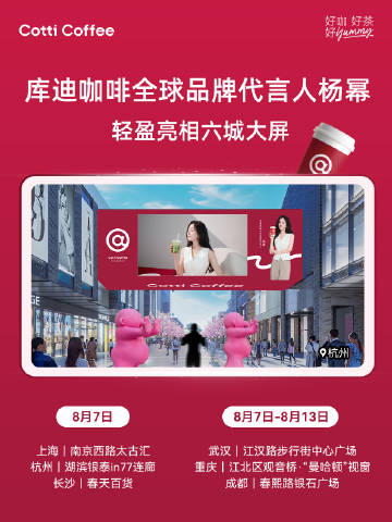 8 月 7 日起,代言人咖茶生活大片也將輕盈亮相上海、杭州、長(zhǎng)沙、武漢、成都、重慶六城商圈大屏,供粉絲六城尋「冪」。打卡代言人大屏有機(jī)會(huì)獲得咖啡飲品券。