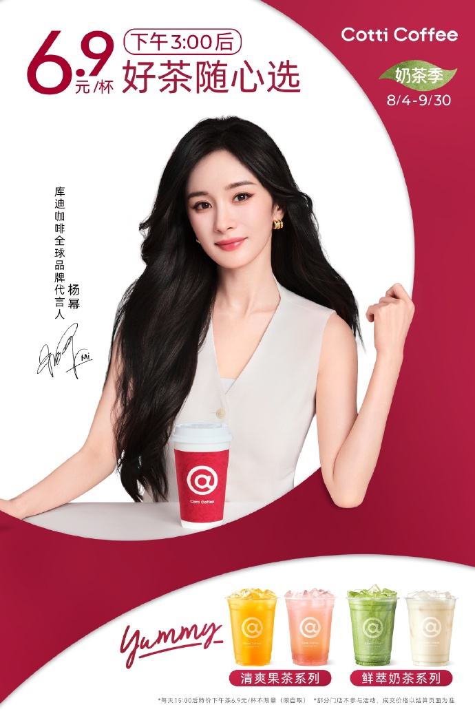 8 月 4 日,庫(kù)迪咖啡正式官宣全球品牌代言人楊冪(明星代言公司),并發(fā)布代言人短片。短片中,沿用代言人楊冪擅玩諧音梗的特質(zhì),邀請(qǐng)大家和楊冪一起解鎖好咖好茶好「yummy」,同時(shí)品牌同步上新羽衣系列飲品。