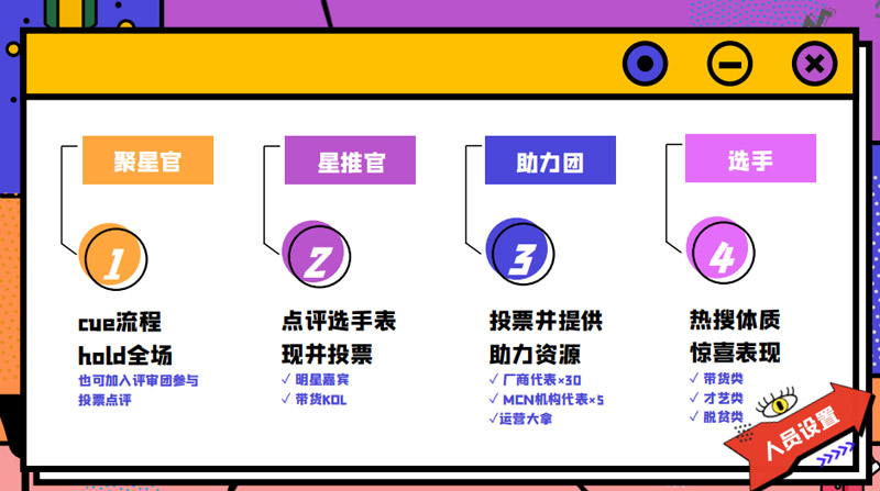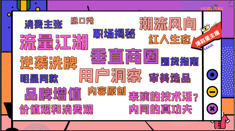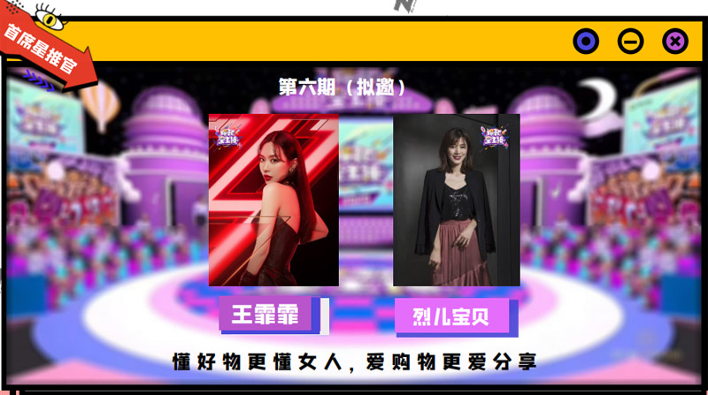 通過多方位呈現(xiàn)主播特色,為年輕主播們搭建了一個個人IP獨家打造的舞臺,一次乘風破浪C位出道的捷徑,明星大咖、帶貨頂流、來自電商、游戲、二次元等各個圈層主播的加入為節(jié)目內(nèi)容增加了精彩看點。