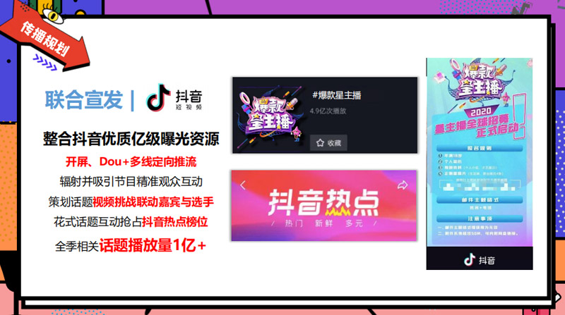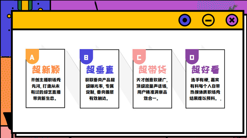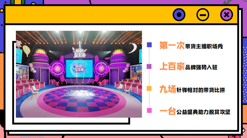 該節(jié)目致力于讓所有懷揣主播夢想的人,展現(xiàn)自己獨特的帶貨方式,通過多方位呈現(xiàn)主播特色,為年輕主播們搭建了一個個人IP獨家打造的舞臺。