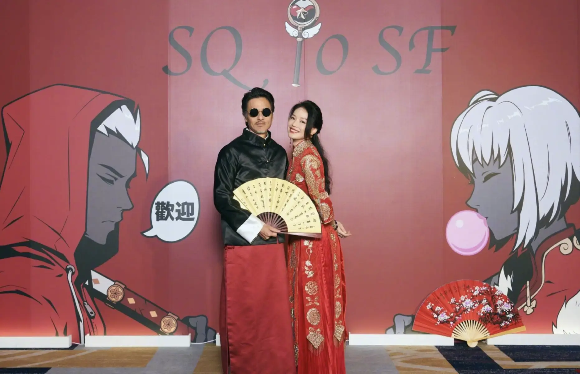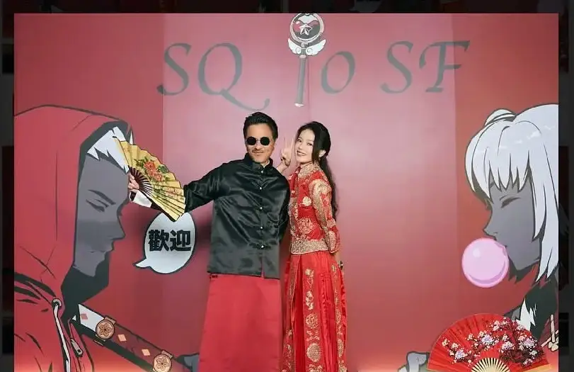 二人都穿中式婚服,一個(gè)戴墨鏡搖扇裝酷,一個(gè)笑容甜美,畫面溫馨,感情超好。