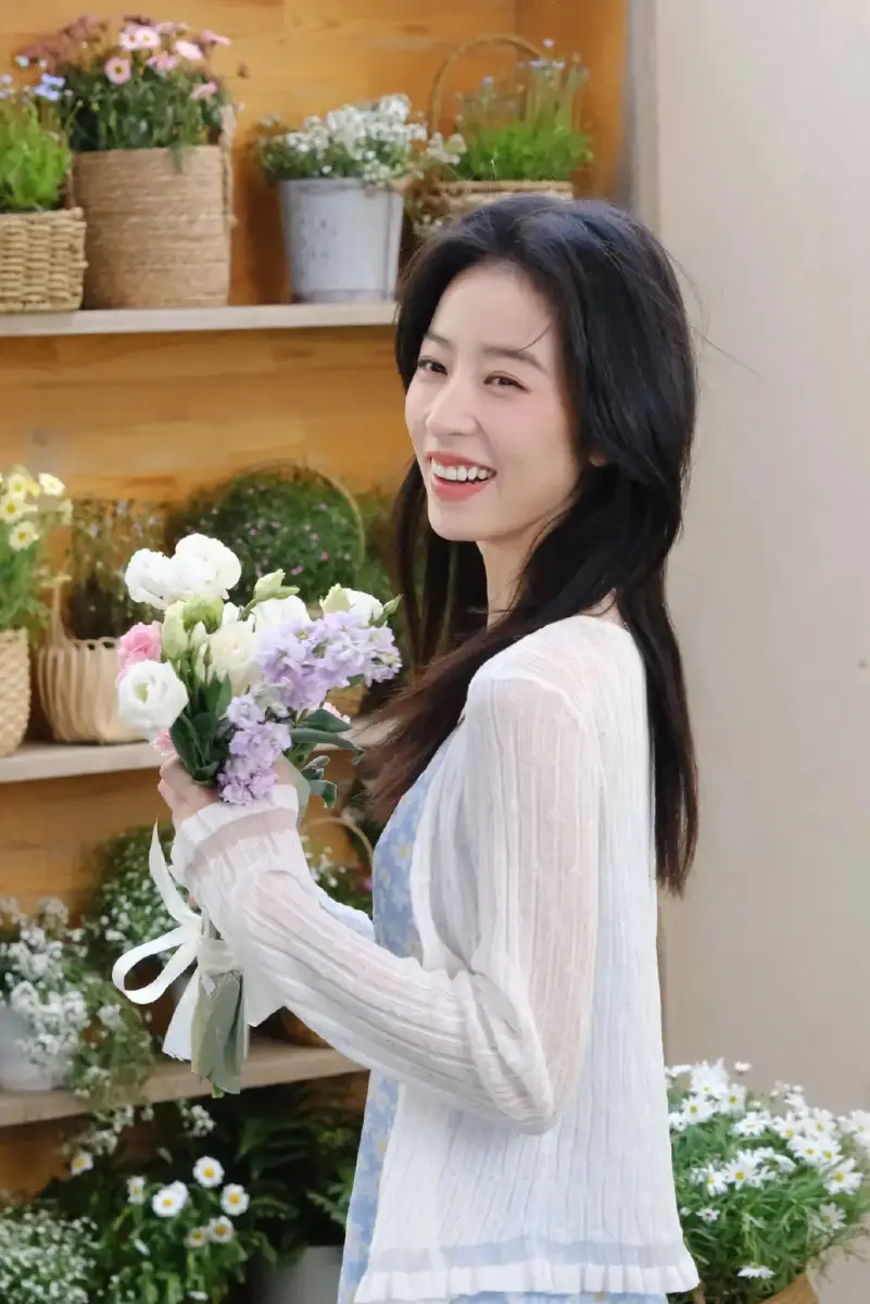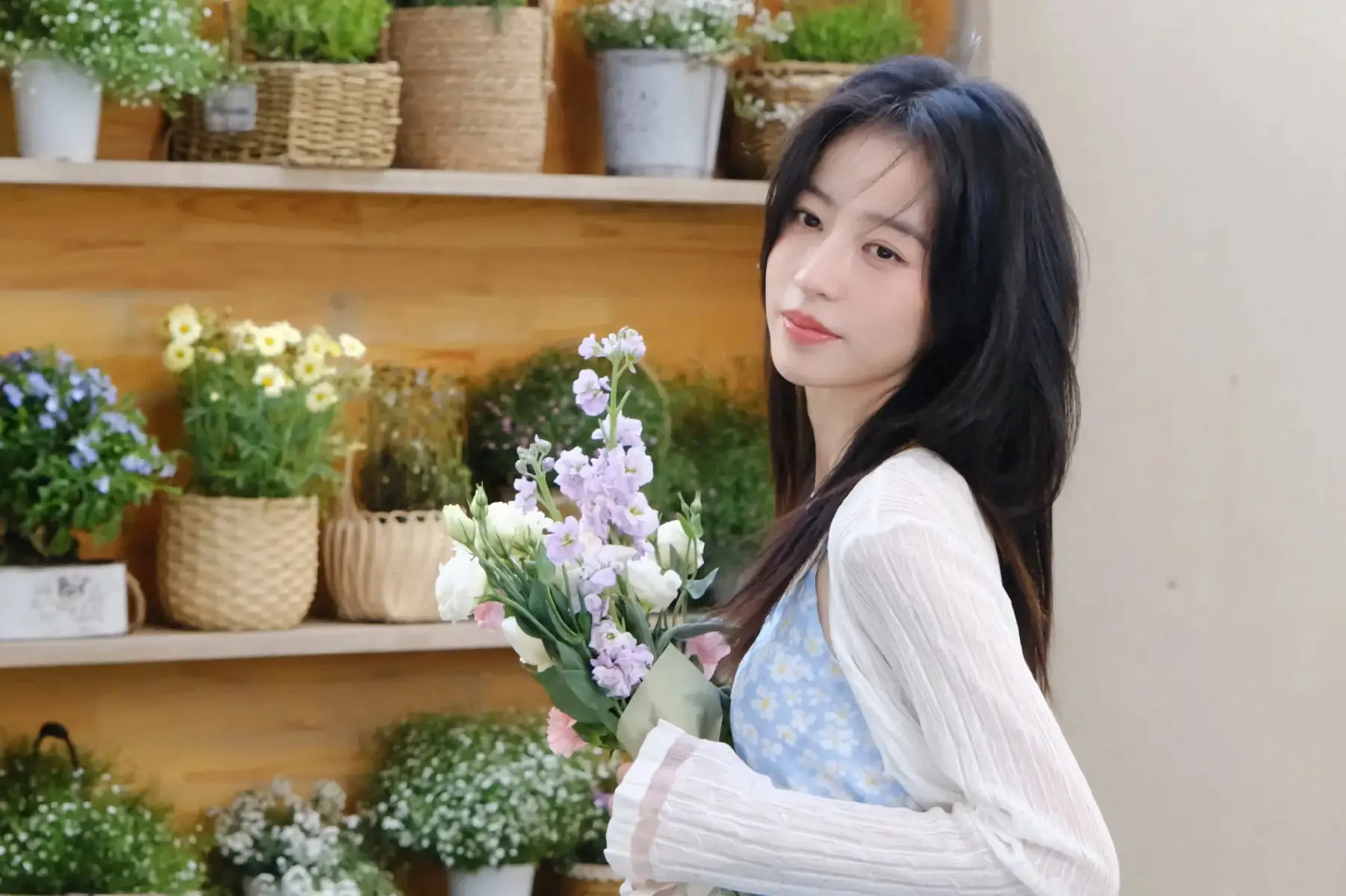 4月24日,周雨彤一組居家美照釋出。穿藍色裙子搭配白色針織衫的周雨彤頗有一種小家碧玉之感。