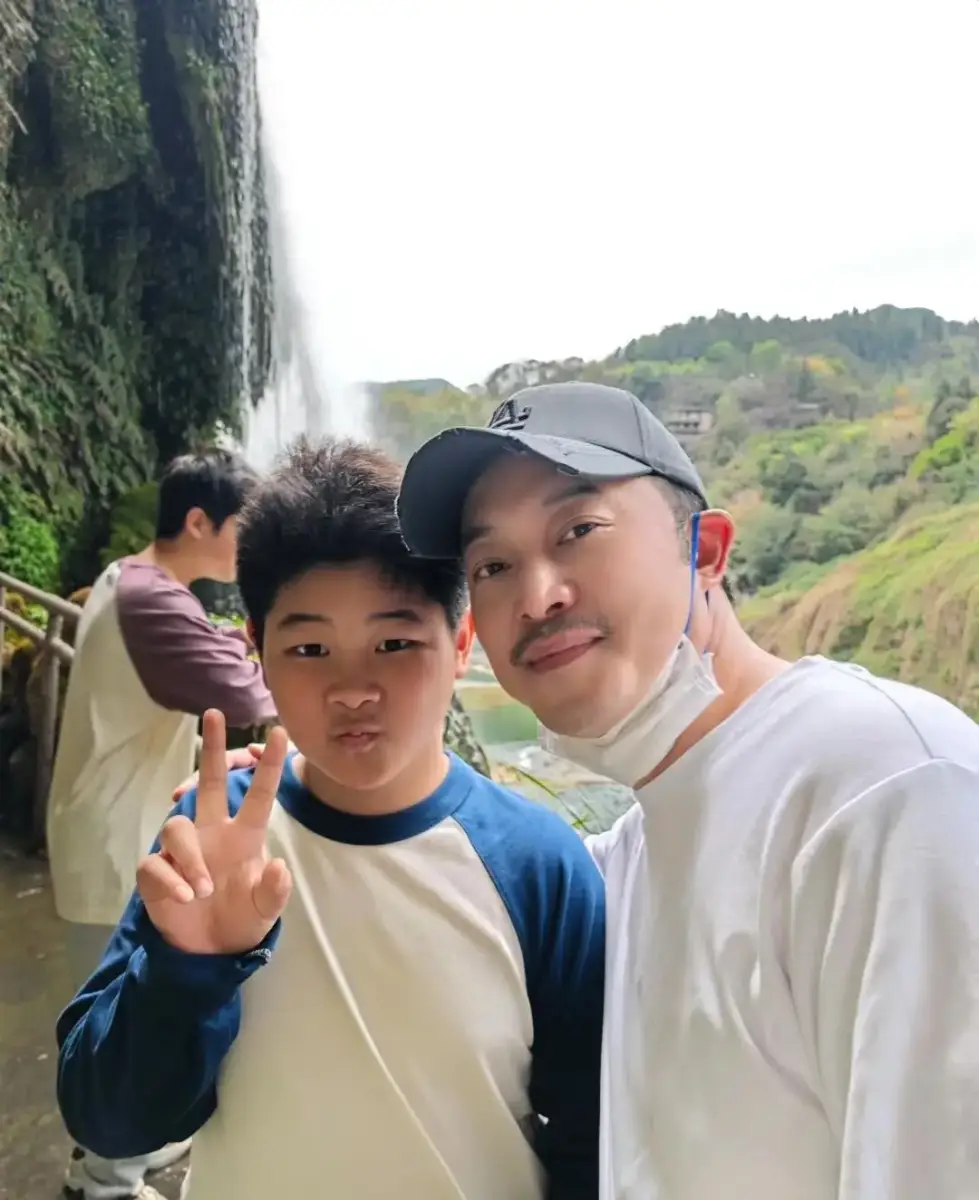 胡可與倆兒子在瀑布前合影留念,笑容非常燦爛。