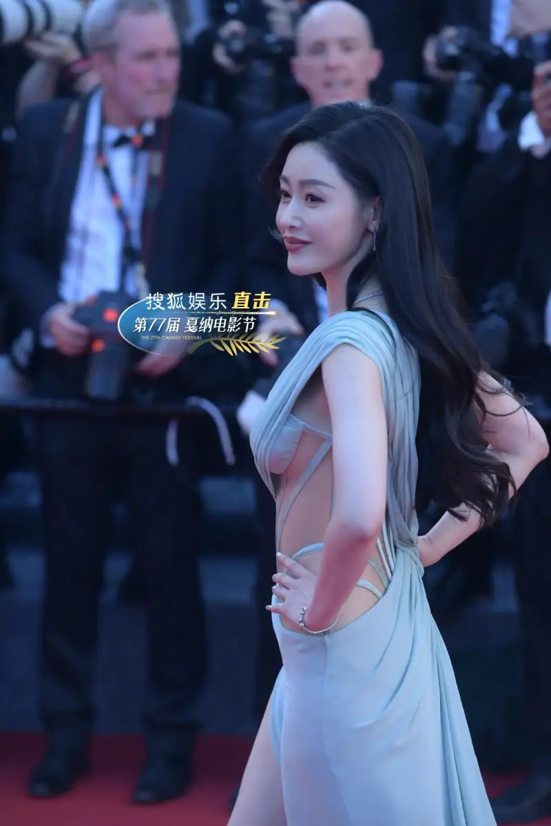 張?zhí)鞇哿料嚓┘{紅毯 穿露腰高開叉禮裙秀白嫩美腿