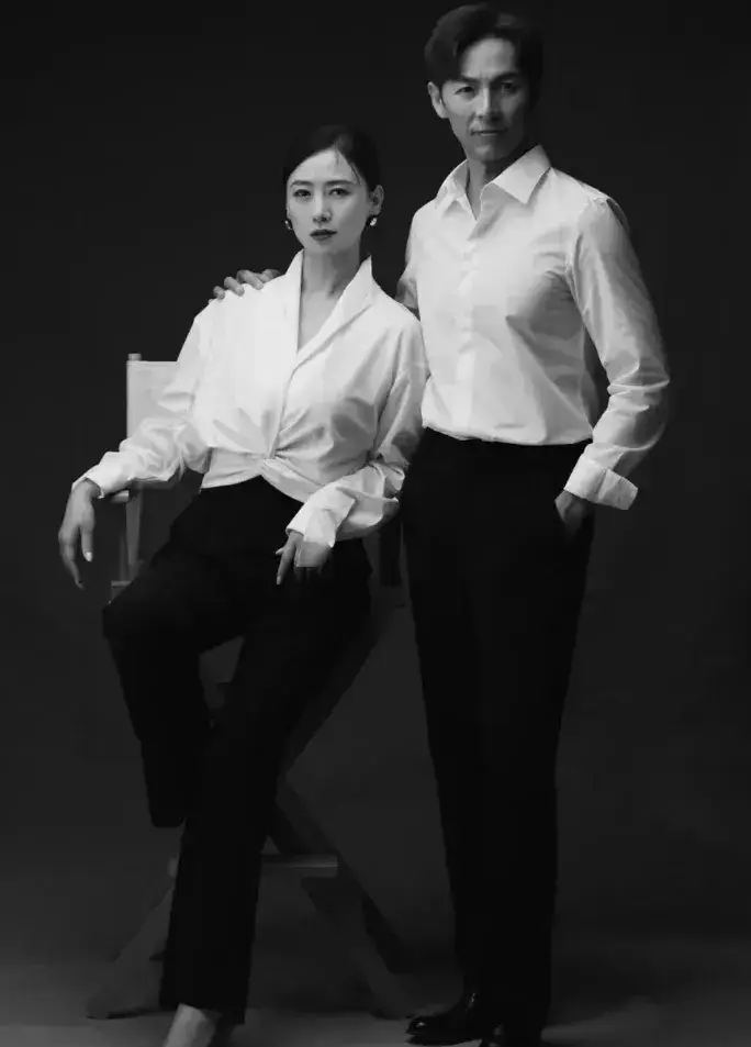 翁虹與老公都穿著白色襯衣搭配黑色長褲,仿佛是職場精英夫妻。