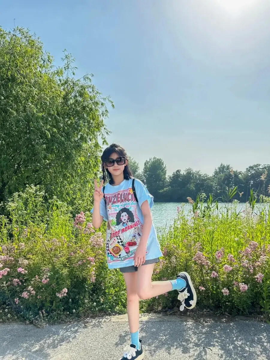 小葉子身穿藍(lán)色印花T恤,十分清爽可愛(ài)。