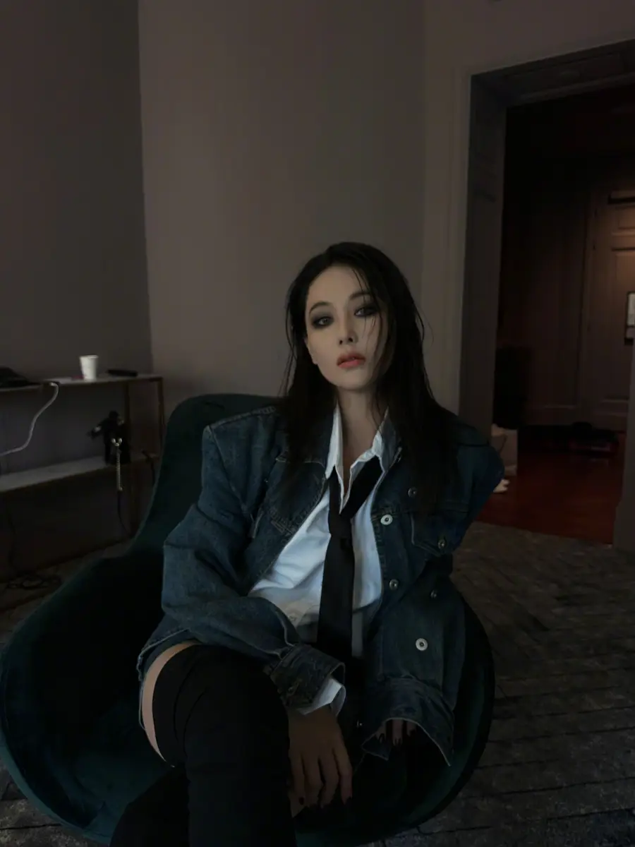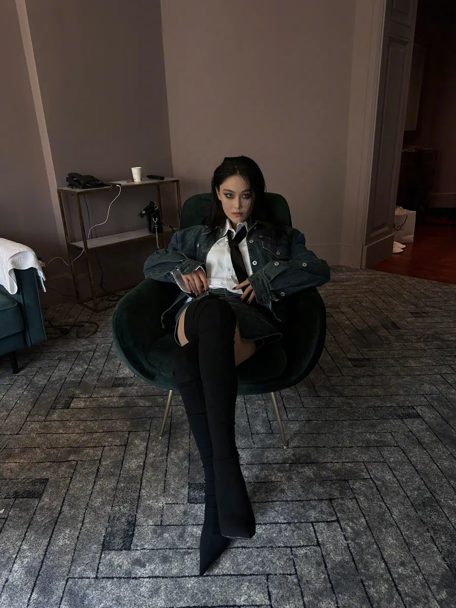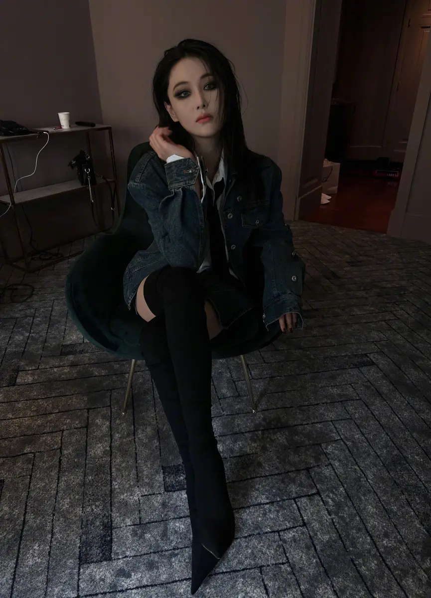 張馨予牛仔外套搭配黑色長筒靴,時尚度滿分。