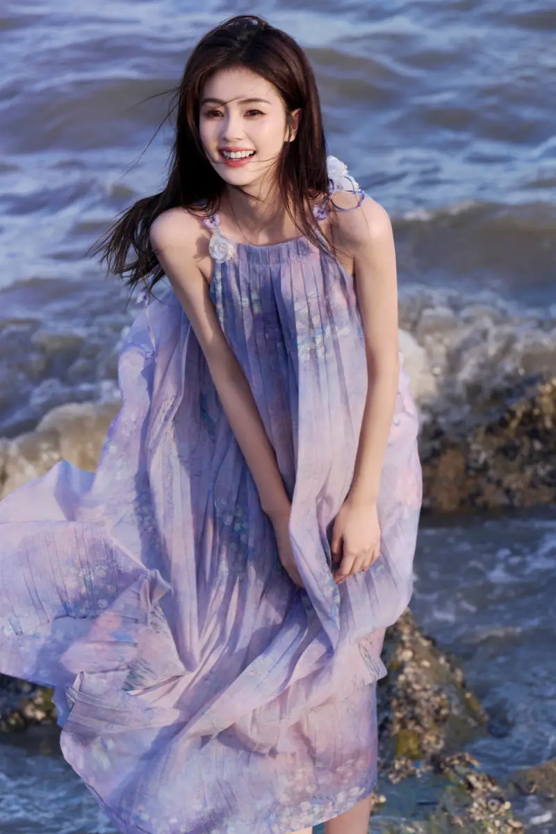 白鹿穿紫色紗裙海邊漫步 側(cè)身燦笑明媚如陽光