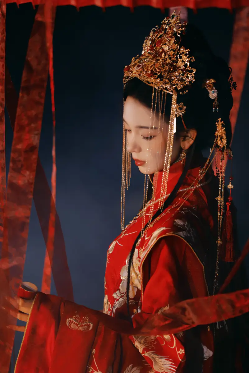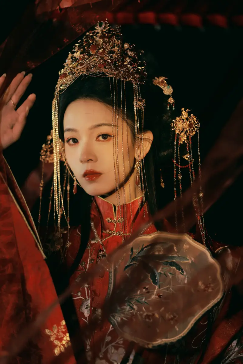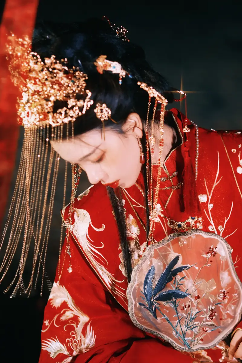 陳瑤低頭持扇,鳳冠流蘇飄拂。