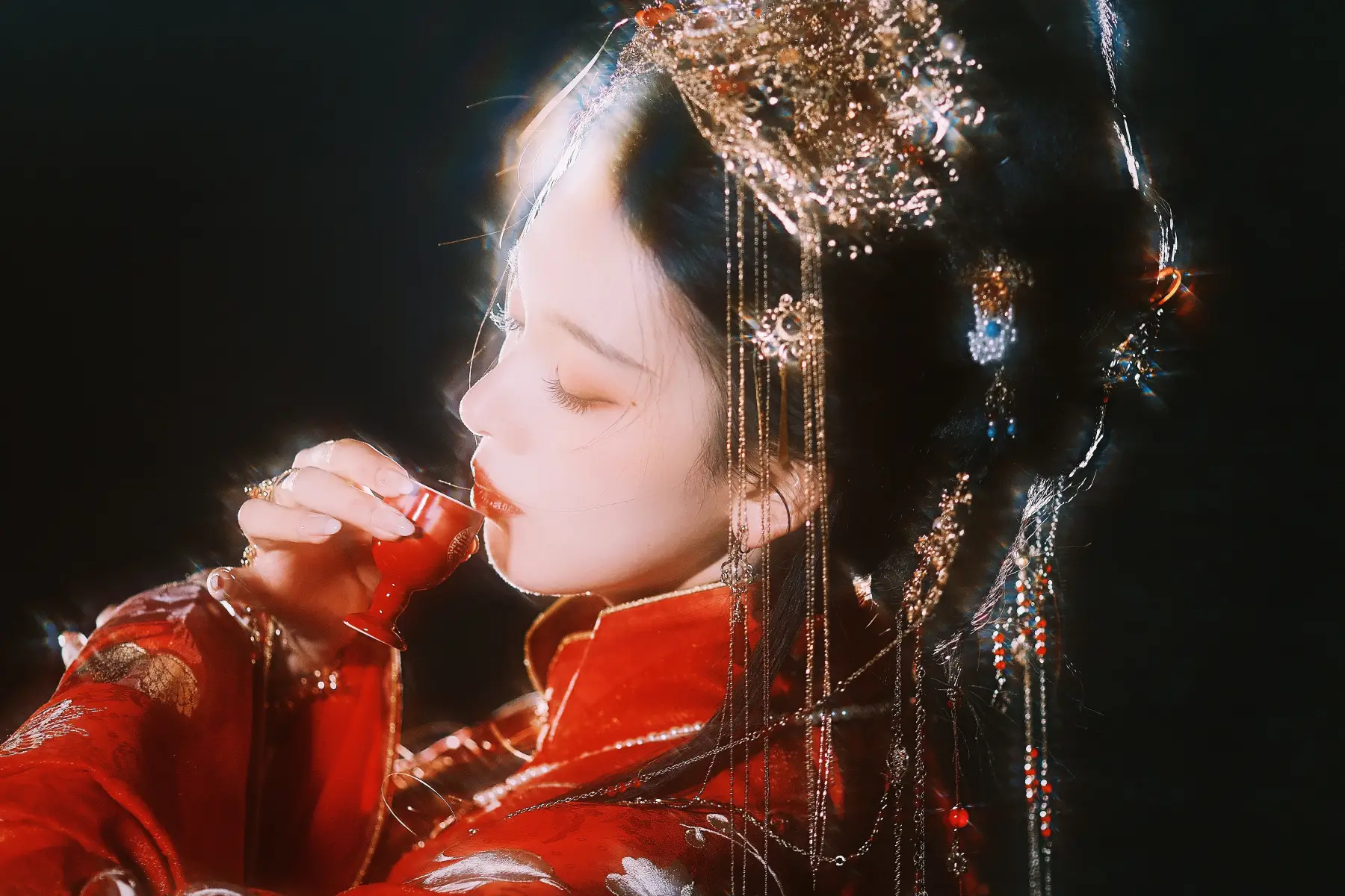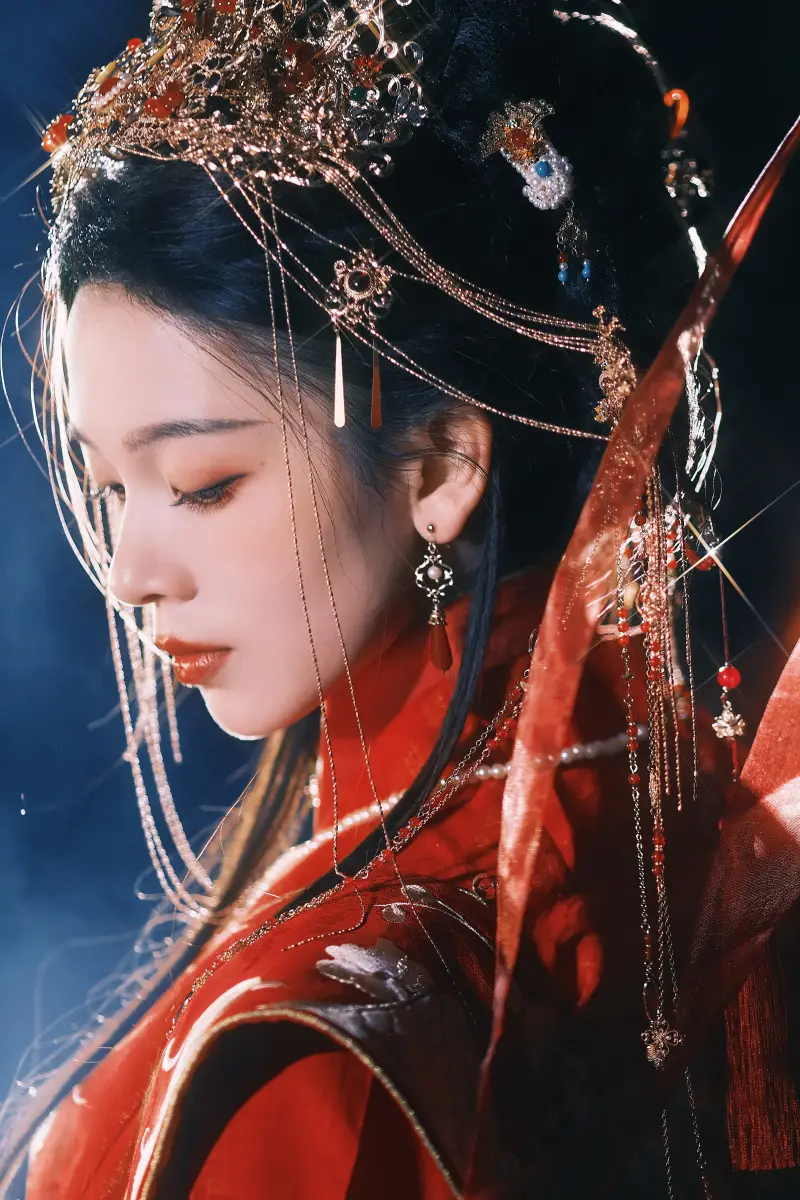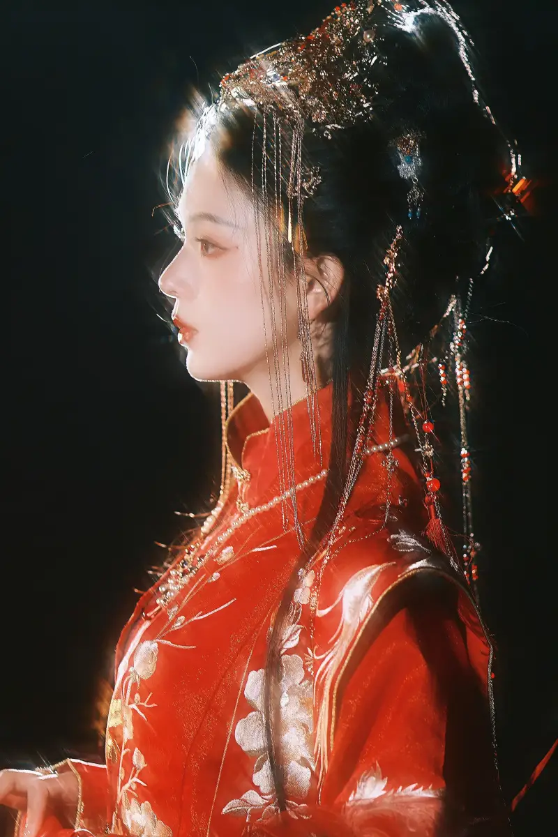 陳瑤頭戴精致鳳冠,側(cè)顏線條優(yōu)越。