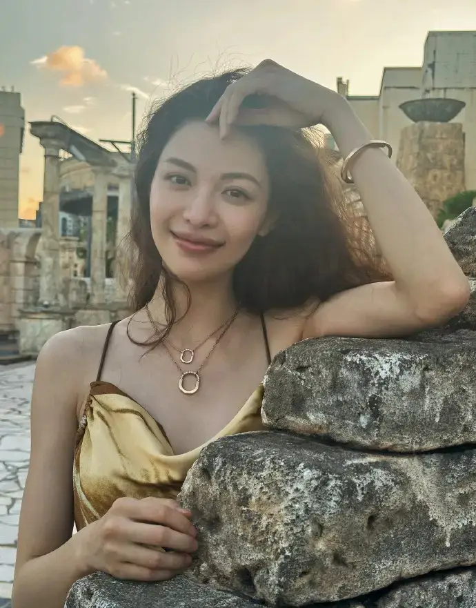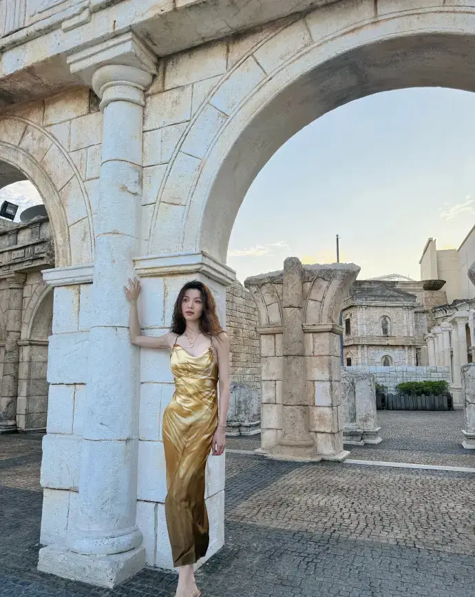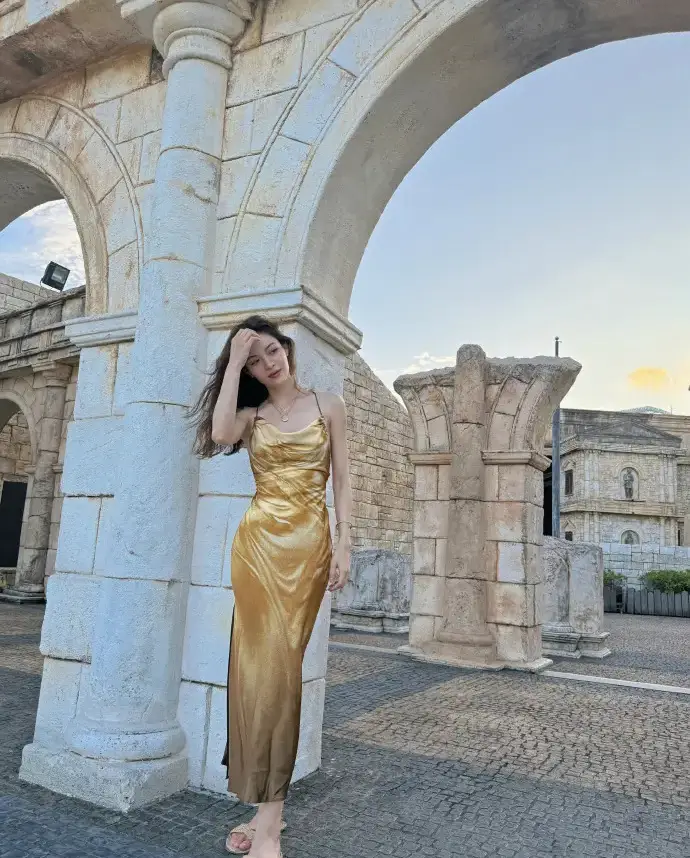 鐘楚曦穿金色吊帶裙漫步澳門 夕陽(yáng)下微笑氣質(zhì)卓越