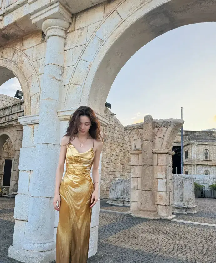 鐘楚曦身穿金色吊帶裙。
