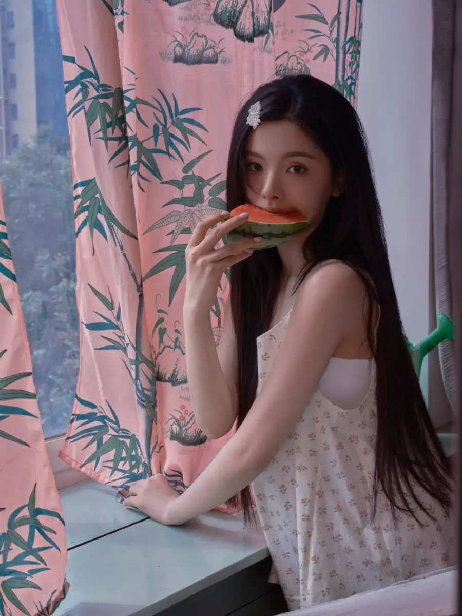 楊超越在炎炎夏日里吃消暑的西瓜。