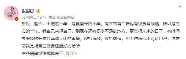 6日,張碧晨(明星經(jīng)紀(jì)公司)在超話里發(fā)長文回應(yīng)粉絲,感謝粉絲一路以來的支持,同時(shí)也提到了部分負(fù)能量滿滿的粉絲,她表示:“有幾個(gè)曾經(jīng)喜歡過我的人,感謝曾經(jīng)的陪伴,感謝我們曾互相給予力量,但現(xiàn)在,我也看到你們幾個(gè)的言論,與其說是清醒提意見,不如說是某種程度的主觀強(qiáng)勢,意見本來也沒有對錯(cuò),但從滿滿的負(fù)能量看得到,喜歡早已不在,人與人之間的體面也沒有保留。”
