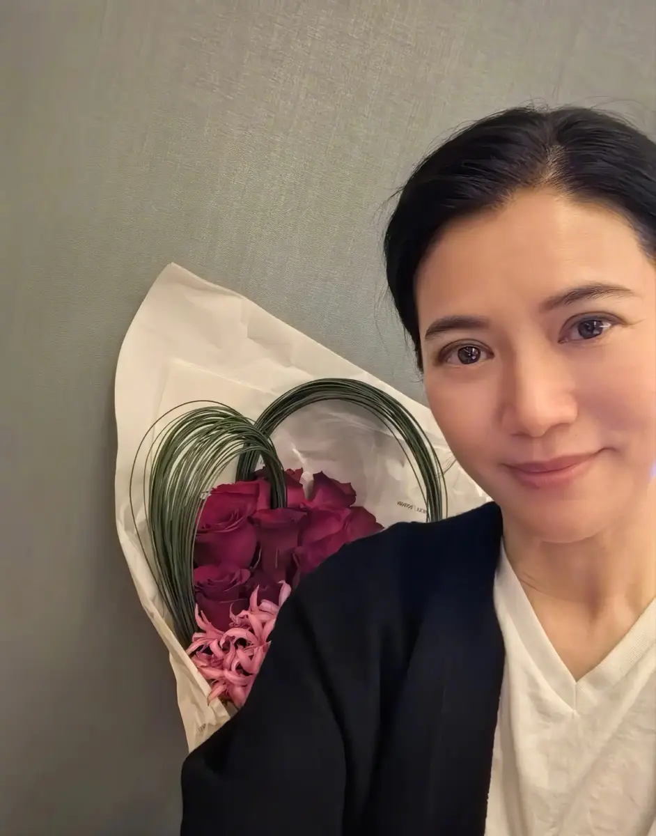 袁詠儀收到老公送的鮮花很驚喜,笑容滿面,心情大好。