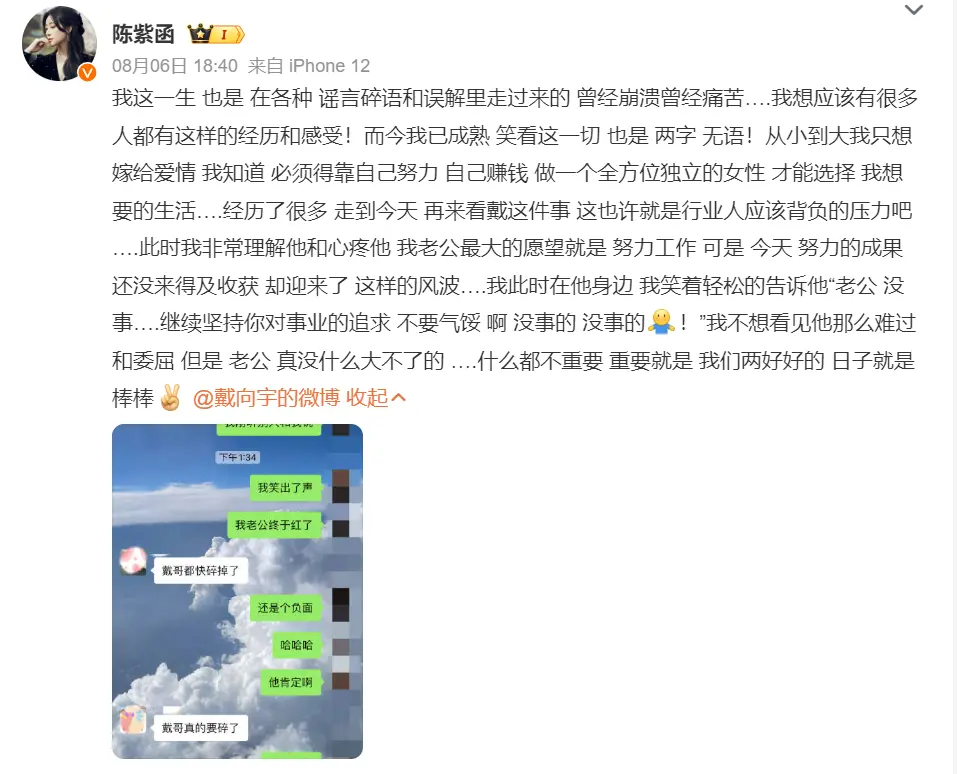 8月6日,陳紫函(明星經(jīng)紀(jì)公司)發(fā)文力挺老公戴向宇,稱自己對曝戴向宇嫖娼事件,只有兩個(gè)字無語,她表示“這也許就是行業(yè)人應(yīng)該背負(fù)的壓力吧”,同時(shí)表達(dá)了對老公的理解和心疼,并告訴他沒事:“老...
