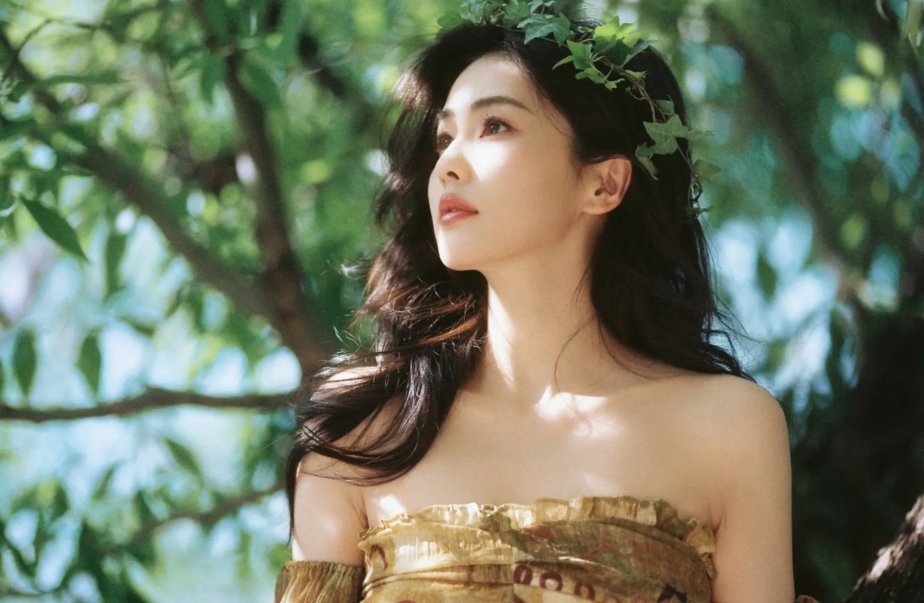 7月1日,一組白鹿(明星經(jīng)紀(jì)公司)身穿復(fù)古抹胸裙的寫真照片釋出,她坐在樹上看書,宛如守護(hù)森林的仙子。