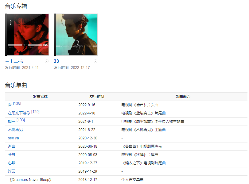 2021年在央視春節(jié)聯(lián)歡晚會(huì)表演小品《每逢佳節(jié)被催婚》。同年主演古裝劇《馭鮫記之與君初相識(shí)》。411日發(fā)行第一張個(gè)人專輯《三十二·立》,上線五分鐘銷量突破50萬,創(chuàng)QQ音樂“鉆石唱片”記錄。
