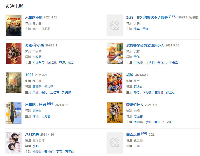 2021520日,主演的電影《夢境俏佳人》定檔  。出演由于飛導(dǎo)演的電影《皮皮魯與魯西西之罐頭小人》。