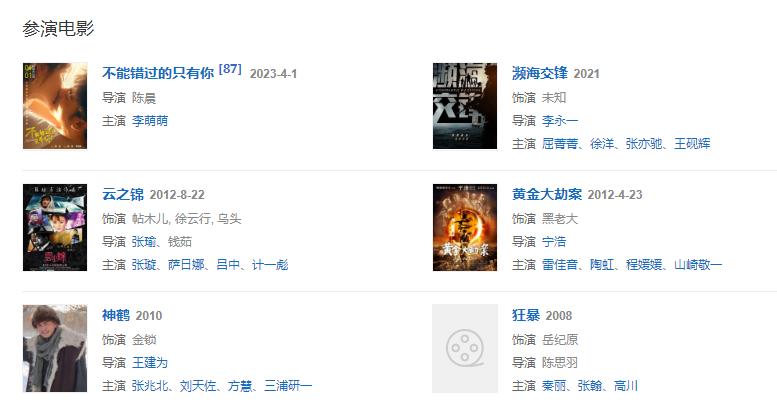 代表作品:歡樂頌、生死線、刀客家族的女人、神犬奇兵、歸還世界給你、大江大河、我們都要好好的、愛在左,情在右