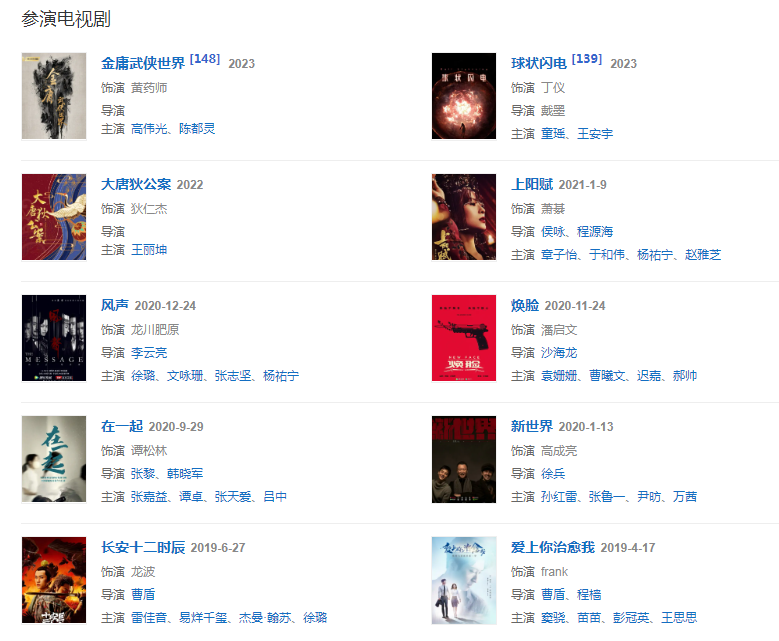 代表作品深牢大獄、空巷子、繡春刀、金牌律師、九州·海上牧云記、紅色、創(chuàng)業(yè)時代、上陽賦、長安十二時辰