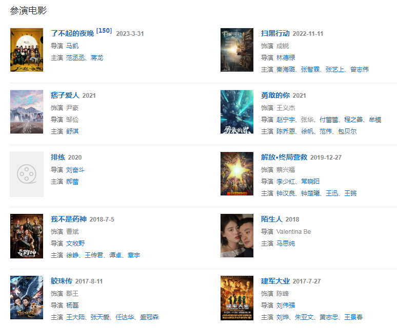 20176月,其主演的電影《我不是藥神》殺青 ;同年,參加浙江衛(wèi)視《演員的誕生》節(jié)目,摘得年度總冠軍; 同年,出席米蘭時裝周 ;同年,參演電視劇《海上牧云記》 和電影《建軍大業(yè)》 。