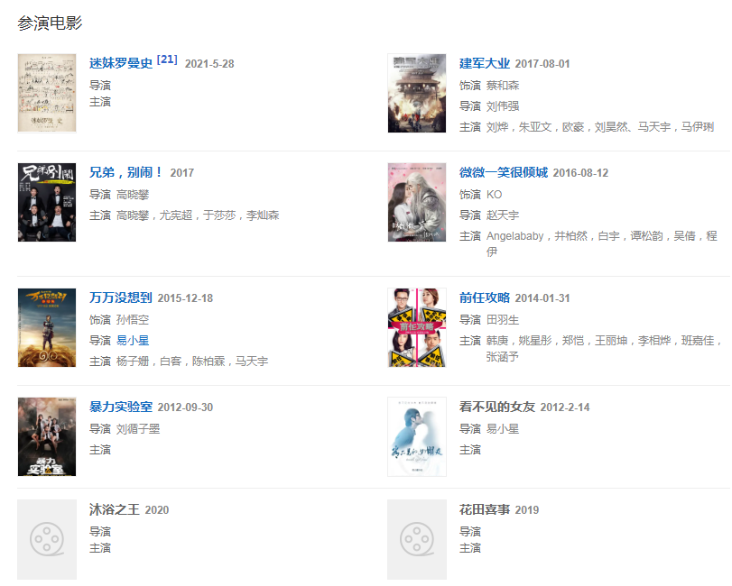 代表作品報告老板、萬萬沒想到、建軍大業(yè)、微微一笑很傾城、高科技少女喵、揚名立萬