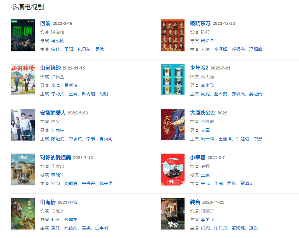 20206月,主演抗疫題材電視劇《在一起》;同年,主演的電視劇《裝臺(tái)》上映。