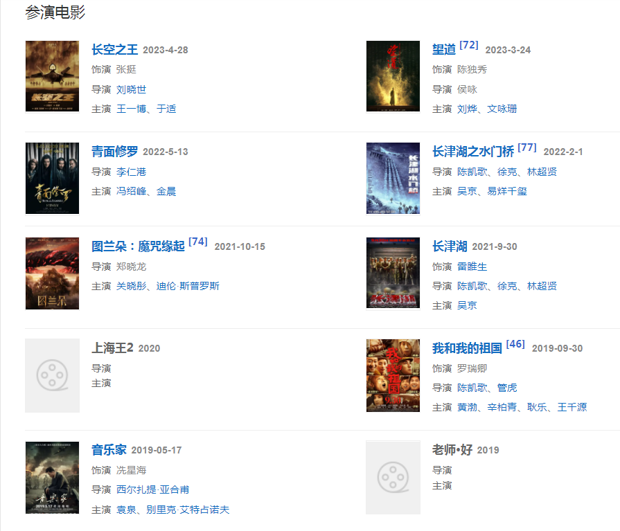 代表作品:藍(lán)宇、天龍八部、金婚風(fēng)雨情、赤壁、十月圍城、好奇害死貓、于無(wú)聲處