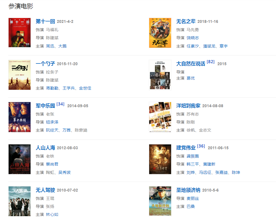 2021212日,在《2021年北京廣播電視臺春節(jié)聯(lián)歡晚會》上與蔣勤勤帶來節(jié)目《我要你》;42日,陳建斌自編自導(dǎo)并領(lǐng)銜主演的電影《第十一回》上映;11月,主演的都市情感劇《不惑之旅》播出;12月,擔(dān)任第32屆華鼎獎評委。