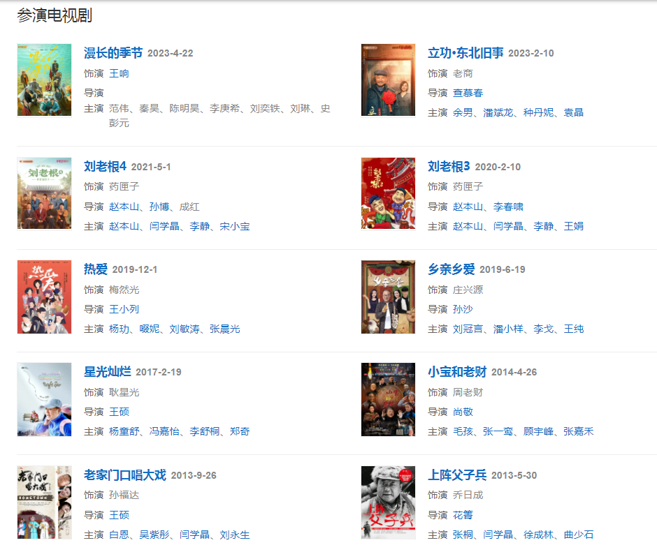 代表作品:劉老根、馬大帥、跟蹤孔令學(xué)、南京!南京!、老大的幸福、小寶和老財、耳朵大有福、即日啟程