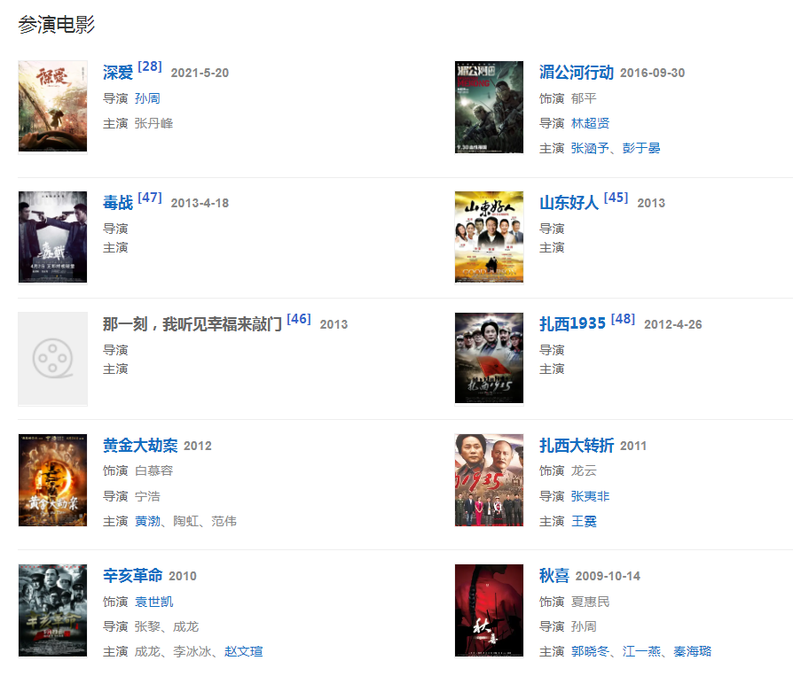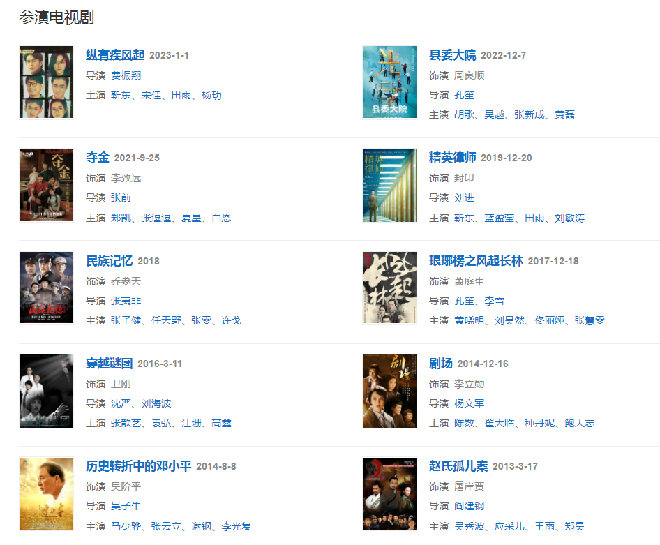 代表作品;走向共和、人間正道是滄桑、幸福來敲門、辛亥革命、趙氏孤兒案、瑯琊榜之風起長林、精英律師