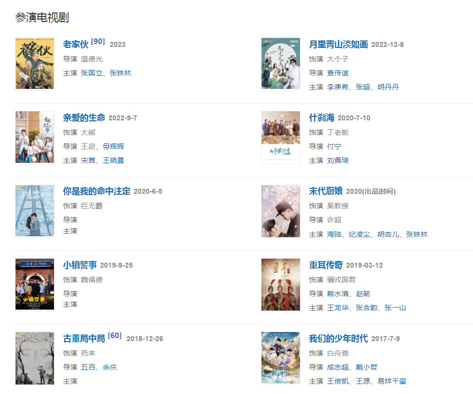 代表作品夜幕下的哈爾濱、家宴、鐵齒銅牙紀(jì)曉嵐、江山風(fēng)雨情、夢斷紫禁城、鐵將軍阿貴、宰相劉羅鍋