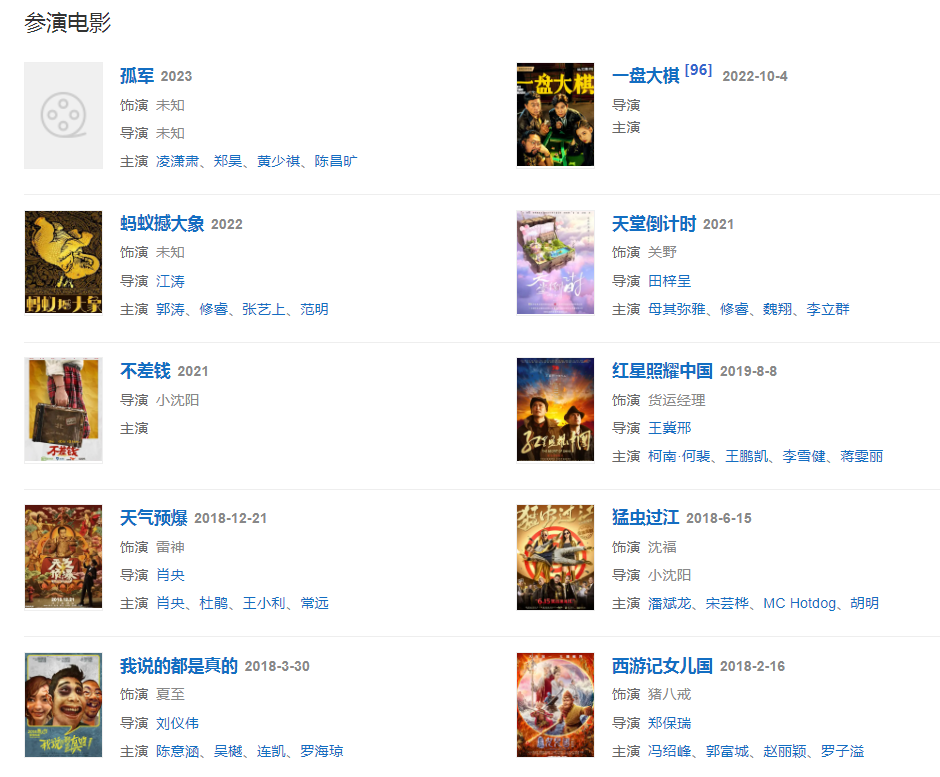 代表作品:不差錢、大笑江湖、三槍拍案驚奇、怪俠歐陽德、后廚、我叫小沈陽、猛蟲過江等、請君 (2022)