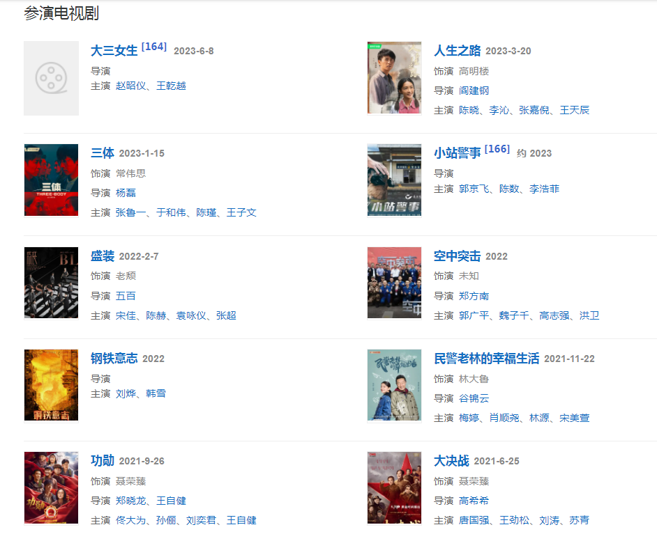 2023年3月20日,特別出演的電視劇《人生之路》播出,飾演高明樓;5月4日,參演的《當(dāng)燃青春》定檔播出。5月26日,特別出演的電影《川流不“熄“》上映 ;6月8日,特別出演的電視劇《大三女生》播出。