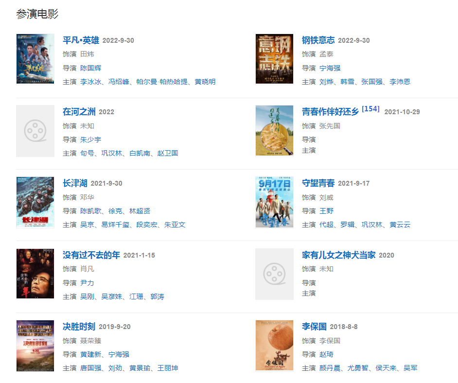 代表作品:王貴與安娜、喜耕田的故事、林師傅在首爾、黎明之前、媽媽像花兒一樣、聶榮臻、左輪手槍