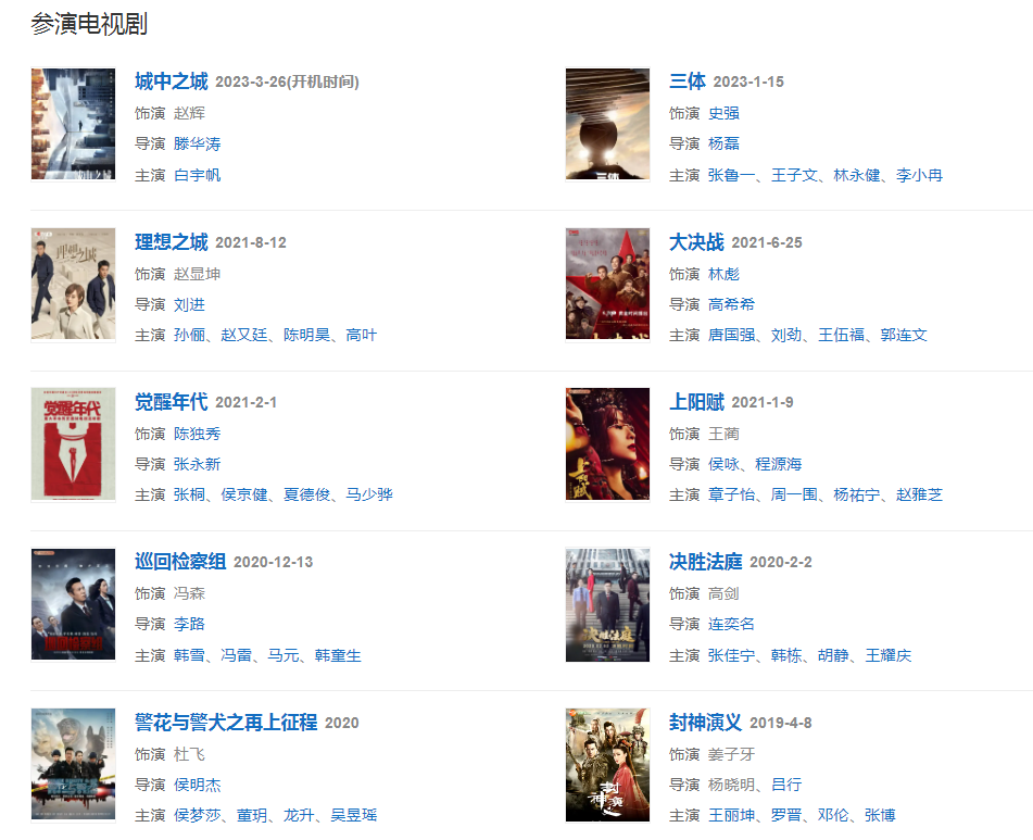 代表作品:懸崖之上、三國(guó)、大軍師司馬懿之軍師聯(lián)盟、獵毒人、刑警隊(duì)長(zhǎng)、決勝法庭、巡回檢察組、刺殺小說(shuō)家、覺(jué)醒年代、建軍大業(yè)、中國(guó)1921、大決戰(zhàn)、我不是潘金蓮、下一站婚姻、理想之城、青盲
