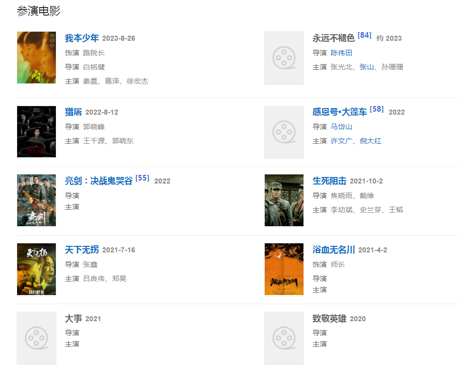 2021年4月2日,出演網(wǎng)絡(luò)電影《浴血無名川》定檔。2021年4月8日,戰(zhàn)爭歷史電影《生死阻擊》 。2021年12月,擔(dān)任第32屆華鼎獎(jiǎng)評委。