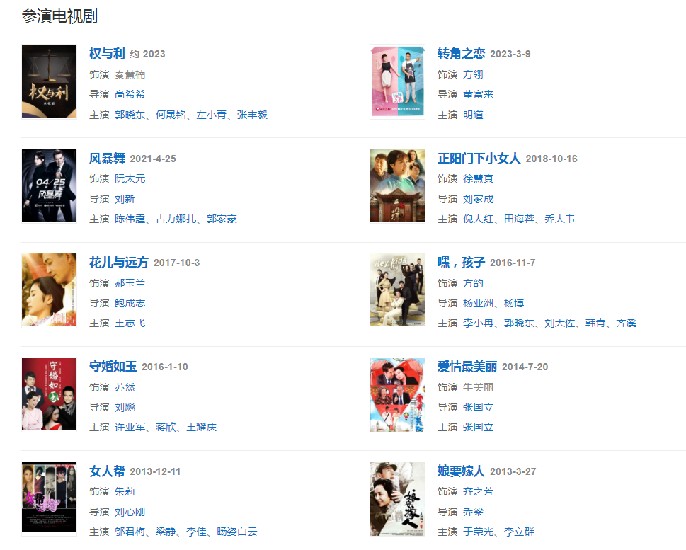 代表作品:牽手、女帥男兵、立春、金婚、幸福來敲門、我們天上見、娘要嫁人、愛情最美麗、守婚如玉