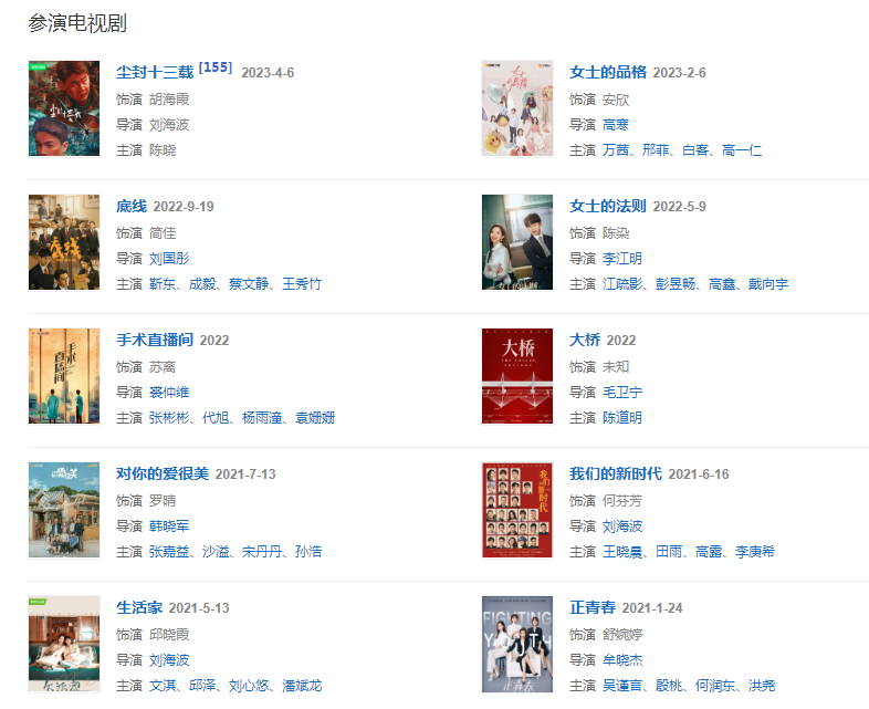 代表作品:湄公河大案、瑯琊榜、偽裝者、因為遇見你、歡樂頌、帶著爸爸去留學、精英律師