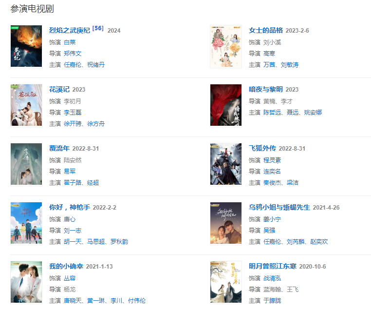 20201月,主演由楊龍執(zhí)導(dǎo)的《我的小確幸》播出 ;同年106日,領(lǐng)銜主演由藍(lán)海翰、王飛執(zhí)導(dǎo)的古裝武俠言情劇《明月曾照江東寒》。