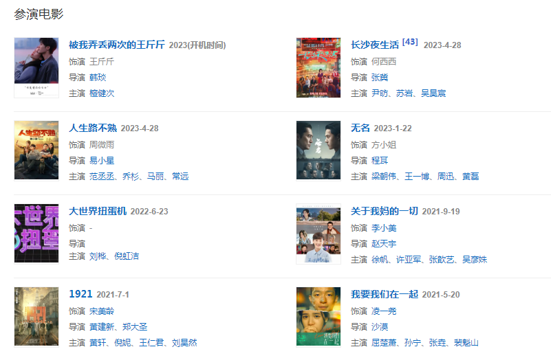 2023年1月22日,張婧儀主演的諜戰(zhàn)電影《無名》上映;2月14日,主演的電影《被我弄丟兩次的王斤斤》官宣 ;4月28日,主演的喜劇電影《人生路不熟》上映 ;同日,搭檔尹昉主演的電影《長沙夜生活》在全國上映,在片中飾演何西西。