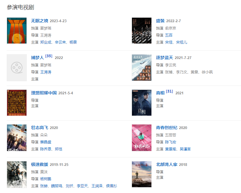 代表作品:深海利劍、萬水千山風(fēng)雨情、別讓我看見、北京愛情故事、極速救援
