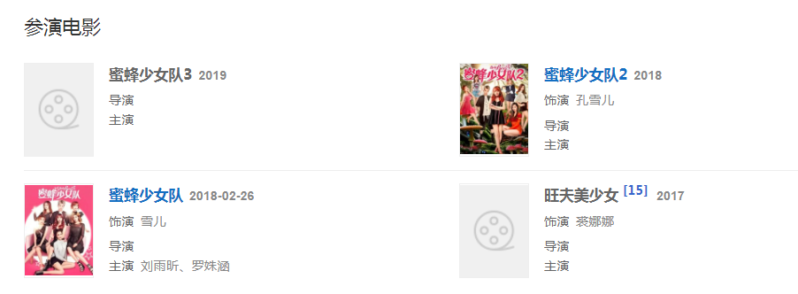 2018年2月26日,參演的根據(jù)同名綜藝節(jié)目衍生的都市勵(lì)志網(wǎng)絡(luò)電影《蜜蜂少女隊(duì)》在愛奇藝上線,并在片中飾演可愛的雪兒,演繹青春時(shí)期堅(jiān)持夢想、奮力追逐的勵(lì)志故事。