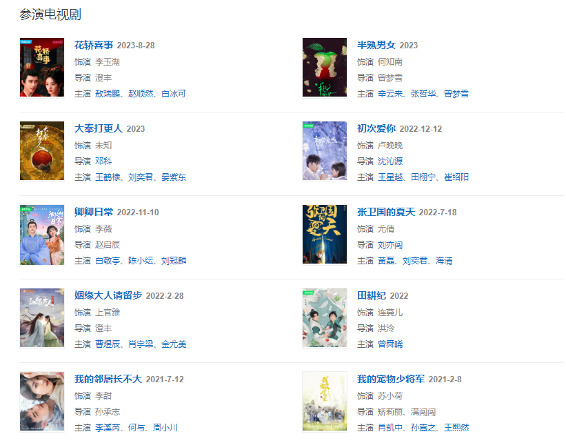 2023年4月18日,參加的《女子推理社》定檔;4月23日,與辛云來、張哲華領(lǐng)銜主演《半熟男女》,在劇中飾演何知南;6月19日,與王鶴棣、劉奕君、晏紫東領(lǐng)銜主演網(wǎng)劇《大奉打更人;8月28日,主演的古裝劇《花轎喜事》播出,在劇中飾演活潑俏皮的李玉湖。