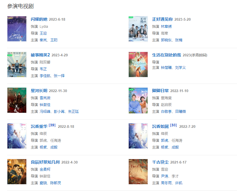 2023年2月26日,與韓棟、王李丹妮等合作主演的古裝玄幻片《聊齋畫壁》在愛奇藝、騰訊視頻上線,她在片中飾演世間最后一只鳳凰尾生;4月29日,出演由韋正編劇并執(zhí)導的情景喜劇《破事精英2》播出,在劇中飾演萬獸集團董事長的女兒陸雙馨;5月20日,出演的非遺文化題材都市劇《正好遇見你》播出;6月18日,出演秦嵐、王陽主演的都市女性情感劇《閃耀的她》播出,飾演靠攀附各種有權(quán)的男人成功上位公司副總的Lydia。