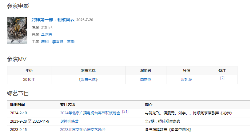 2023年,主演的神話史詩電影《封神第一部:朝歌風(fēng)云》在中國大陸上映。
