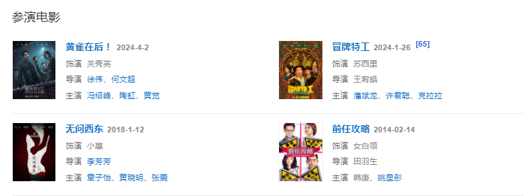 2024年1月26日,領(lǐng)銜主演的喜劇電影《冒牌特工》上映;4月3日,主演的犯罪懸疑片《黃雀在后!》上映,飾演歌廳小姐關(guān)秀英。5月8日,與秦俊杰、劉宇寧合作主演晚清末年題材劇《天行健》播出,在劇中飾演留洋歸來的晚清格格烏蘭珊。
